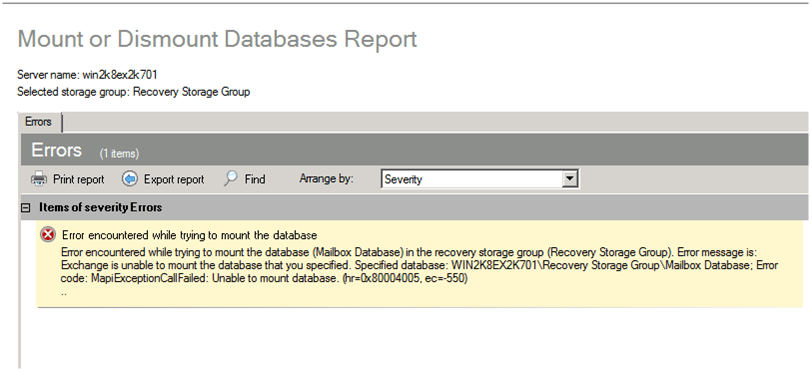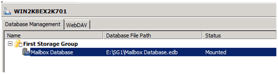 Une fois le groupe de stockage de récupération créé, il faut monter la base de données en utilisant l’option « Mount or Dismount databases … »