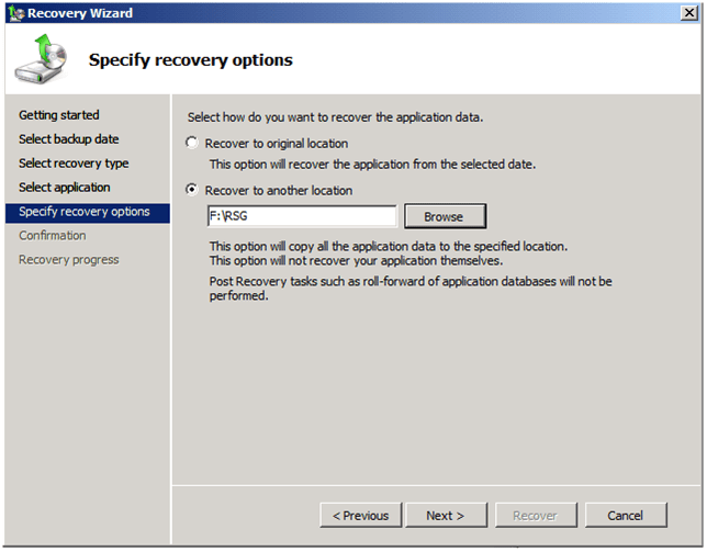 Dans le manu, choisir de créer un « Recovery Storage Group »