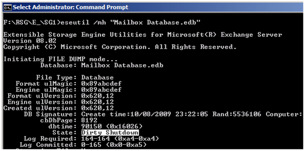 La base de données restauré en dans l’état « Dirty Shutdown » comme vous pouvez le voir ci-dessous, nous devons utiliser l’utilitaire ESEUTIL afin de faire passer cet était en « Clean Shutdown »