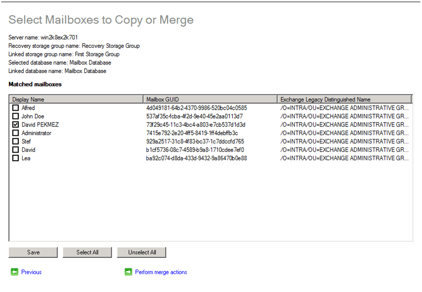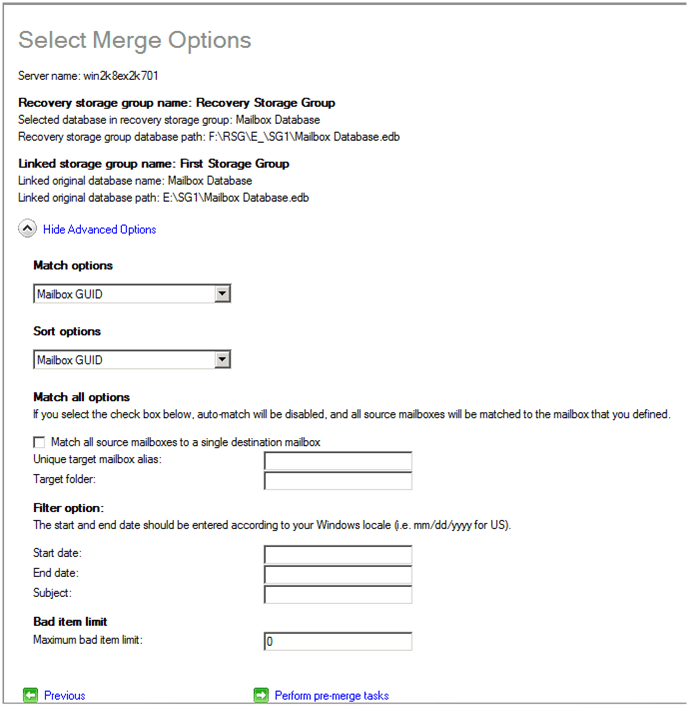 Cette seconde option nécessitera l’utilisation d’outils Exchange afin de restaurer certains mails par exemple dans des Boîtes existantes (Merge)