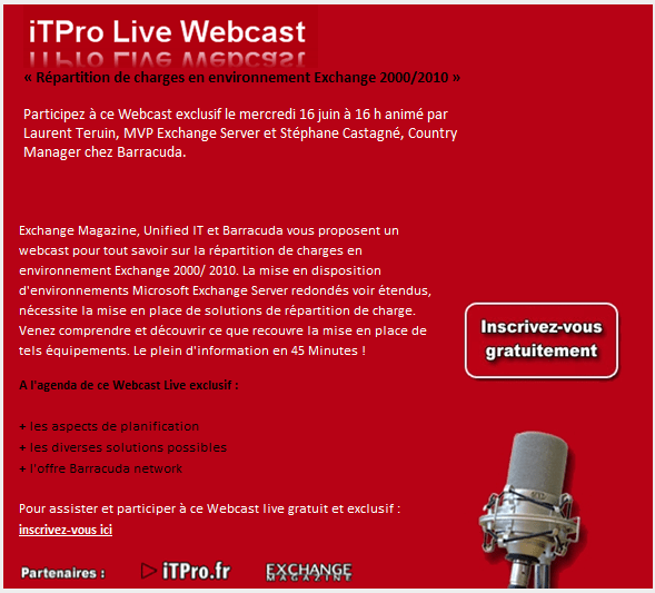 Bonjour. Eh oui en cette fin d’année scolaire, nous sommes prolixes… et nous vous convions à un petit séminaire pour expliciter les problématiques de répartition de charge en environnement Exchange. Le but : vous donnez le maximum d’information en 45 Minutes. Je serais accompagné de l’excellent Stéphane Castagné et d’un consultant Barracuda à qui vous pourrez poser en direct toutes les questions que vous désirez.