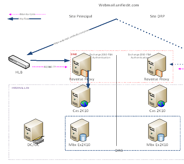 Dans un article précédent (https://unifiedit.wordpress.com/2010/08/18/exchange-2010-plaidoyer-pour-les-repartiteurs-de-charges-materiels/), j’avais préconisé l’usage de répartiteur matériel. Je vous rassure je n’ai pas changé d’avis. Mais je me permets de revenir vers vous vis-à-vis d’une problématique que vous allez rencontrer si vous envisager de mettre en place des HLB (Répartiteurs de charge matériels) vers des serveurs reverse proxy TMG, ISA ou autre. Dans le cas où vous envisagez de mettre un site de secours (DRP) comme le précise la figure suivante plusieurs règles seront à établir.