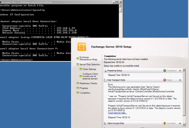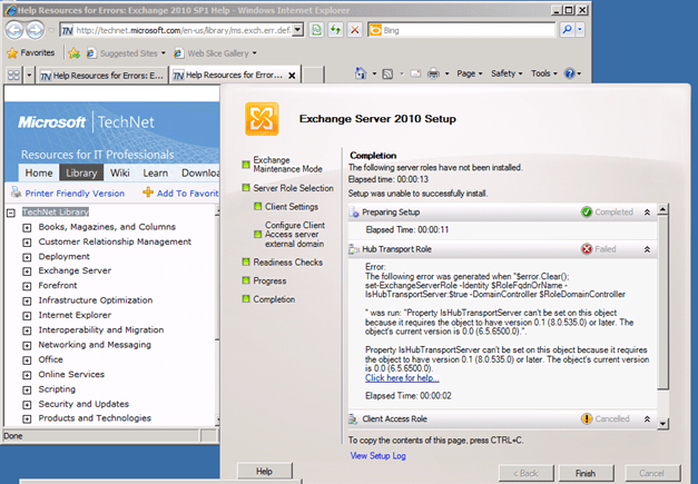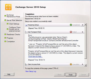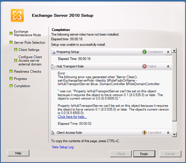 [10/22/2010 08:13:05.0268] [1] [ERROR] Property IsHubTransportServer can’t be set on this object because it requires the object to have version 0.1 (8.0.535.0) or later. The object’s current version is 0.0 (6.5.6500.0).