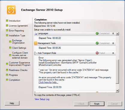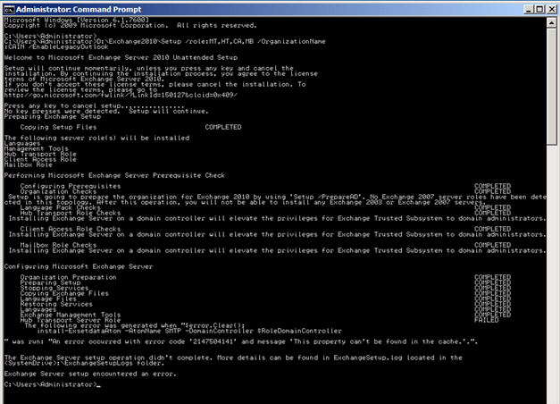 [10/22/2010 07:41:06.0221] [1] 0. ErrorRecord: Microsoft.Exchange.Management.Deployment.ExsetdataException: An error occurred with error code ‘2147504141’ and message ‘This property can’t be found in the cache.’.