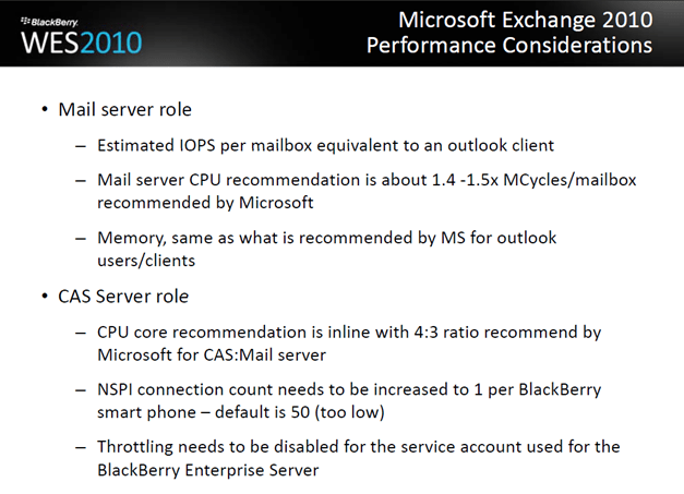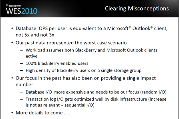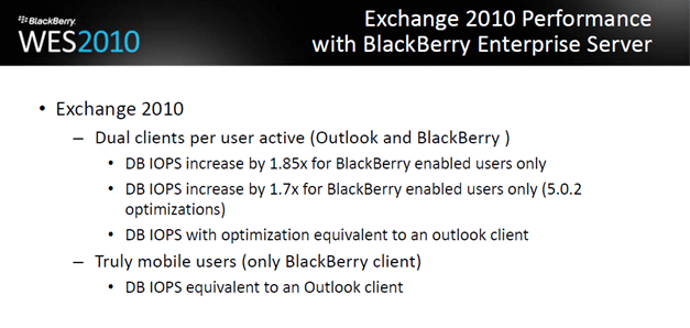Rim lors d’une conférence qui s’est tenue le 29 Avril de cette année à mise en ligne un document ou l’on apprend que les BBY Devices ne consommeraient pas plus qu’un client Outlook si l’on utilise la version BES 5.0.2 en environnement Exchange 2010.
