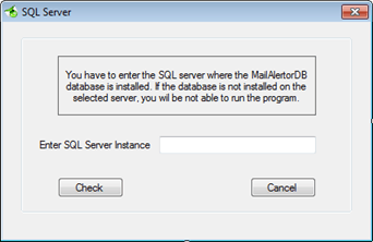 Click on the Check button. If the application cannot connect to the MailALertorDB database on the SQL server, you will have an error message and the application will stop.
