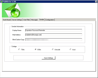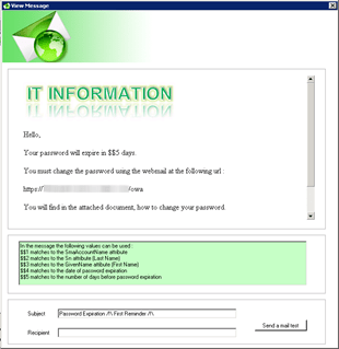 The goal of this application is to provide to administrators of an Active Directory domain to manage accounts for users connected outside network company.This application is used to inform users of the need to change their password. Passwords can be changed using the Outlook Web Access. Three mails are sent to the user. One 15 days before the expiration date, one 7 days before expiration and one 1 day before expiration.The number of days can be set in the application, depending on the policies of the company.