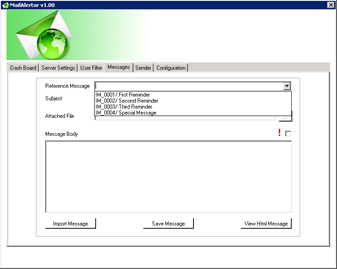 To create a new message enter a name for the reference message, enter a subject, enter the body message or import a html message with the Import message button and select Save message. The application will create a random number for the message and add the message to the list. All reference messages start by IM_