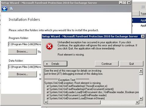 You can encountered a warning when you reinstall FPE2010 on Exchange 2010 SP1: Unhandled exception has occurred in your application… « Root element is missing »