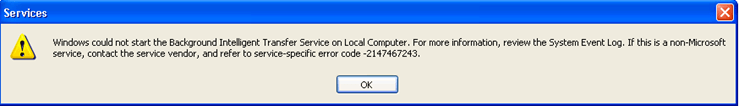 Vérification du service BITS : il est arrêté, en démarrage automatique et quand nous essayons de le lancer nous obtenons l’erreur suivante