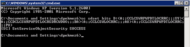sc sdset bits D:(A;;CCLCSWRPWPDTLOCRRC;;;SY)(A;;CCDCLCSWRPWPDTLOCRSDRCWDWO;;;BA)(A;;CCLCSWLOCRRC;;;AU)(A;;CCLCSWRPWPDTLOCRRC;;;PU)