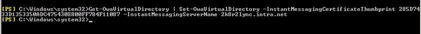Get-OwaVirtualDirectory | Set-OwaVirtualDirectory –InstantMessagingCertificateThumbprint THUMBPRINT –InstantMessagingServername NOMDUSERVEURLYNC