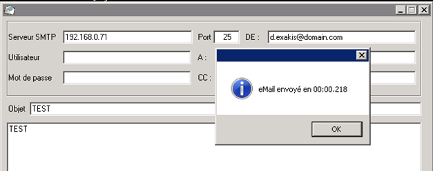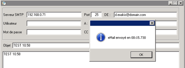 Test de mail envoyé à 10h58.00, la réponse du serveur 250 2.1.5 Recipient OK intervenait à 10h58.15 et le mail partait aussitôt ensuite.