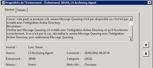 L’agent d’archivage Lync Server n’a pas pu créer de file d’attente d’administration locale pour les accusés de réception. Cause : cela peut se produire si le service Message Queuing n’est pas disponible ou s’il n’est pas installé avec l’intégration Active Directory.