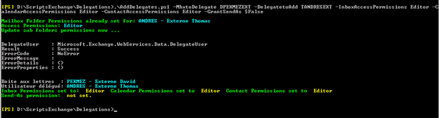 .\AddDelegates.ps1 -MbxtoDelegate DPEKMEZEXT -DelegatetoAdd TANDRESEXT -InboxAccessPermissions Editor -CalendarAccessPermissions Editor -ContactAccessPermissions Editor -GrantSendAs $False