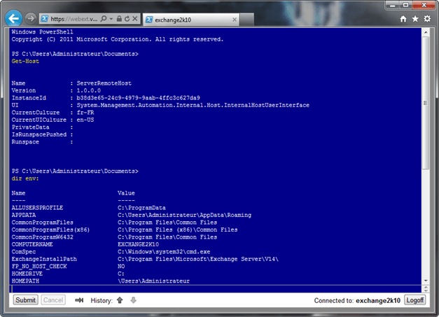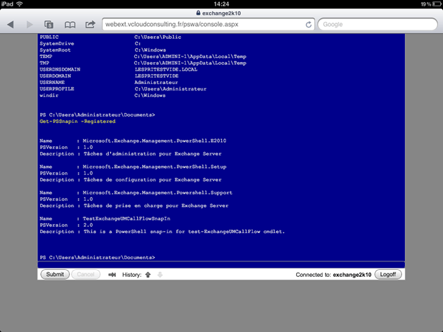 Me voilà sur mon serveur Exchange 2010, il ne reste plus qu’à charger la PSSnapin d’Exchange 2010 pour l’administrer.