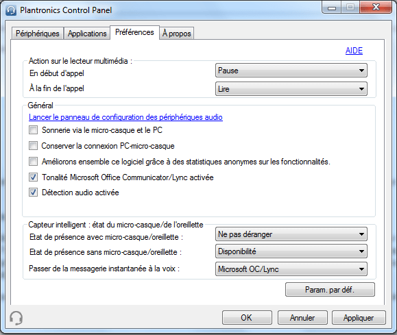 Faites le test, installez votre oreillette et votre statut Lync va être modifié de la façon dont vous aurez ajusté son comportement dans le panneau de contrôle Plantronics.