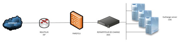 La mise en place d’un répartiteur de charge ou ADC va en partie conditionner la façon dont ce dernier doit agir avec vos serveurs Exchange. La première possibilité est de placer votre Répartiteur de charge en coupure de vos infrastructures Parefeux