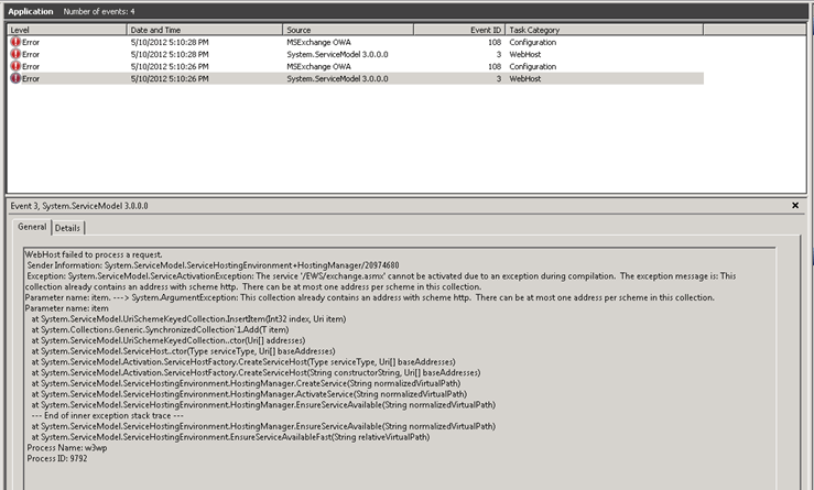 Exception: System.ServiceModel.ServiceActivationException: The service ‘/EWS/exchange.asmx’ cannot be activated due to an exception during compilation. The exception message is: This collection already contains an address with scheme http. There can be at most one address per scheme in this collection.