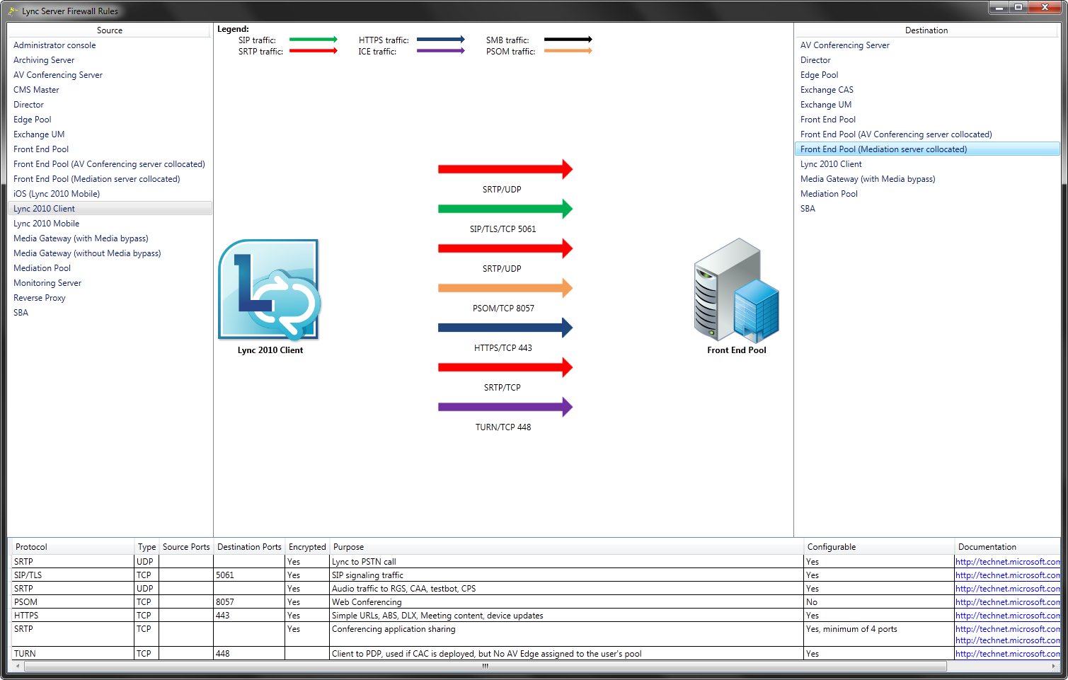 En effet, Lync Server utilise de nombreux protocoles différents et il est parfois difficile de correctement paramétrer les différents firewalls lors de la mise en place d’une infrastructure Lync. L’avantage de cet outil réside surtout dans son exhaustivité. On pourra facilement sélectionner une source et directement visualiser les destinations possibles ainsi que la configuration associée.