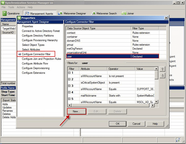 Sélectionnez Configure Connector Filter puis user. Nous allons ensuite rajouter un filtre selon les attributs de nos objets utilisateurs en cliquant sur New.