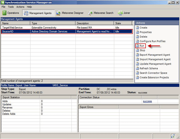 Sélectionnez SourceAD puis cliquez sur Run dans le panneau droit.