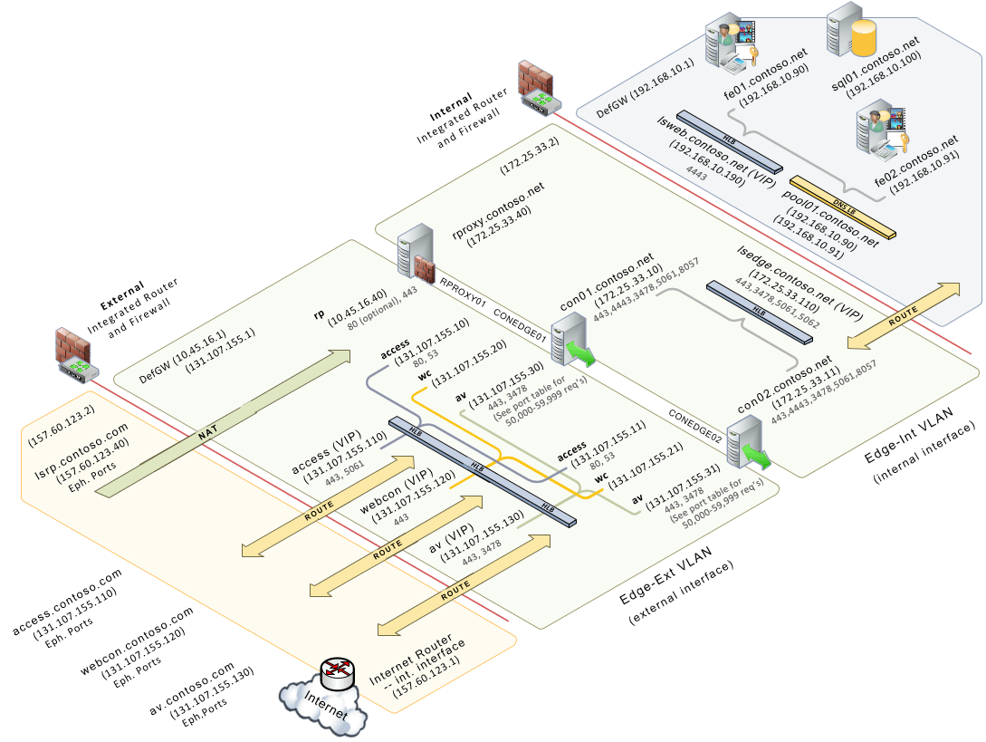 Si vous regardez bien le schéma ci-dessous issu de la documentation Microsoft vous constaterez que les répartiteurs de charges mais aussi les cartes externes des serveurs Edge en place, portent directement les adresses IP publiques. Cette configuration si vous la présentez à votre RSSI préféré ne tardera surement pas de le faire réagir….. d’autant plus qu’il vous faudra annoncer dans un deuxième temps la liste des ports de communications à ouvrir 😉