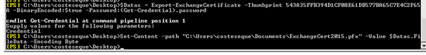 $Datas = Export-ExchangeCertificate -Thumbprint 543A35FFB394D1CF08E61DB577BA65C7E4C2F65A -BinaryEncoded:$true -Password:(Get-Credential).password