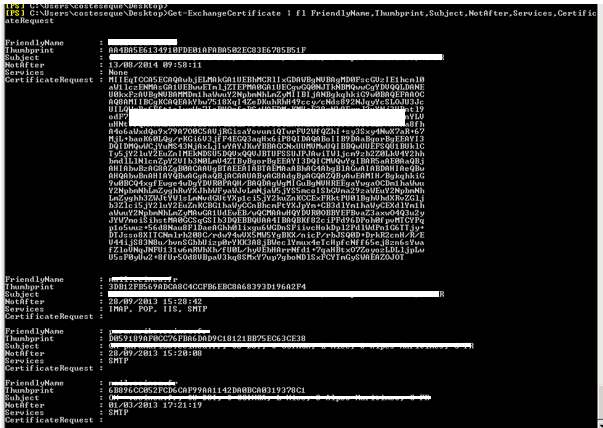 Get-ExchangeCertificate | fl FriendlyName,Thumbprint,Subject,NotAfter,Services,CertificateRequest