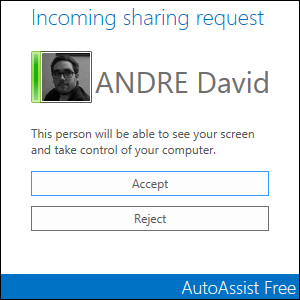 Il suffira au technicien support de taper dans la fenêtre IM le mot $share$ pour qu’un pop-up apparaisse du côté de l’utilisateur. L’utilisateur pourra accepter ou ignorer la demande de partage. S’il accepte, le contrôle du poste sera automatiquement donné au technicien.