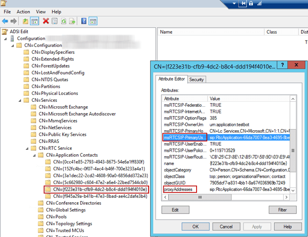 Pour y remédier, Ouvrir la partition de Configuration dans ADSI EDIT puis naviguer dans Services/RTCService/Application Contacts puis identifier le CN précédemment relevé.