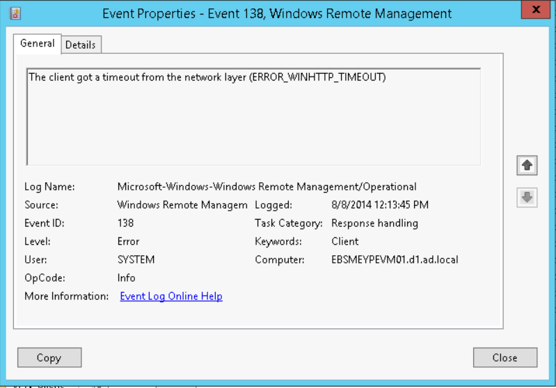 Machine= »AAABBBCCCS01.xx.bb.loc »><f:Message>WinRM cannot complete the operation. Verify that the specified computer name is valid, that the computer is accessible over the network, and that a firewall exception for the WinRM service is enabled and allows access from this computer. By default, the WinRM firewall exception for public profiles limits ccess to remote computers within the same local subnet. </f:Message></f:WSManFault>