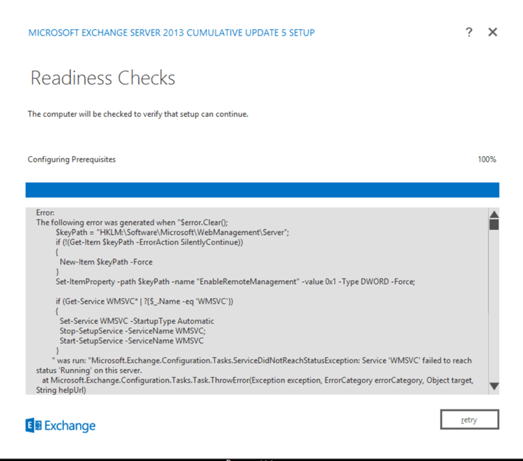 » was run: « Microsoft.Exchange.Configuration.Tasks.ServiceDidNotReachStatusException: Service ‘WMSVC’ failed to reach status ‘Running’ on this server at Microsoft.Exchange.Configuration.Tasks.Task.ThrowError(Exception exception, ErrorCategory errorCategory, Object target, String helpUrl) at Microsoft.Exchange.Configuration.Tasks.Task.WriteError(Exception exception, ErrorCategory category, Object target) at Microsoft.Exchange.Management.Tasks.ManageSetupService.WaitForServiceStatus(ServiceController serviceController, ServiceControllerStatus status, Unlimited`1 maximumWaitTime, Boolean ignoreFailures, Boolean sendWatsonReportForHungService) at Microsoft.Exchange.Management.Tasks.ManageSetupService.StartService(ServiceController serviceController, Boolean ignoreServiceStartTimeout, Boolean failIfServiceNotInstalled, Unlimited`1 maximumWaitTime, String[] serviceParameters) at Microsoft.Exchange.Management.Tasks.ManageSetupService.StartService(String serviceName, Boolean ignoreServiceStartTimeout, Boolean failIfServiceNotInstalled, Unlimited`1 maximumWaitTime, String[] serviceParameters) at Microsoft.Exchange.Management.Tasks.StartSetupService.InternalProcessRecord() at Microsoft.Exchange.Configuration.Tasks.Task.<ProcessRecord>b__b() at Microsoft.Exchange.Configuration.Tasks.Task.InvokeRetryableFunc(String funcName, Action func, Boolean terminatePipelineIfFailed) ».