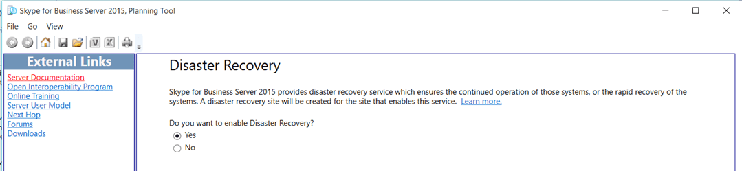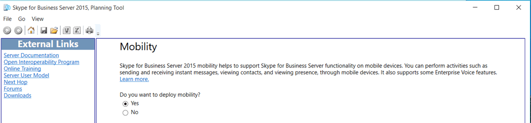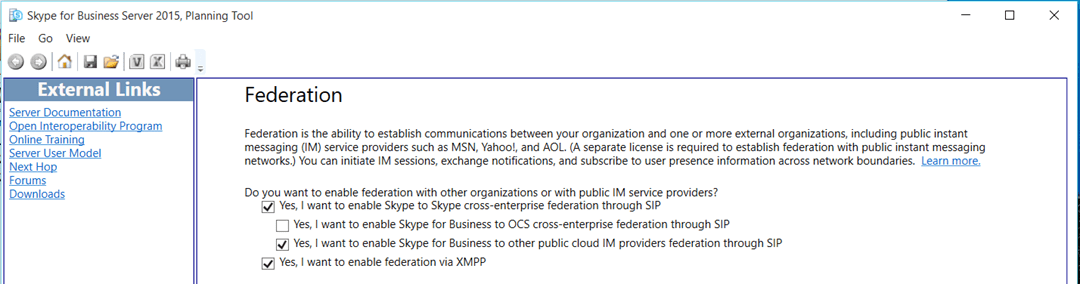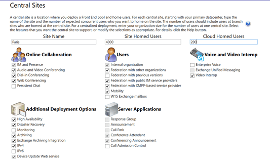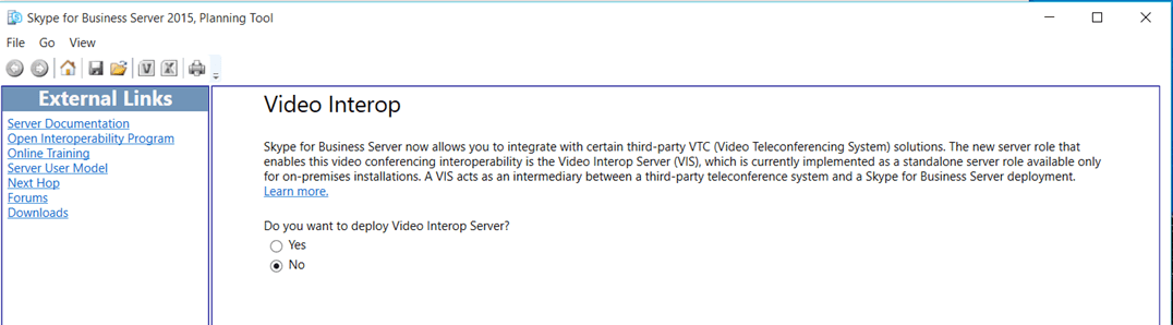 Le 10 decembre de cette année Microsoft vient de mettre en ligne le planning tools pour Skype for Business server pour les clients qui projettent de mettre en place une solutions OnPremise. Microsoft ne les a donc pas oubliés. Alors certes on fait du neuf avec du vieux certains d’entre vous dirons, mais si cela n’est pas la panacée le planning tools permet de voir comment Microsoft propose de déployer la solution et permet également de vous apporter quelques éléments de référence incontournables. En exécutant ce programme que vous pouvez récupérer sur le lien suivant : https://www.microsoft.com/en-us/download/details.aspx?id=50357 il est assez facile de mettre en place une configuration supportée par l’éditeur en quelques minutes. Pour les habitués de la version précédente, On voit apparaitre quelques nouveautés comme les fonctionnalités de Vidéo Intérop avec les VTC et qui est désormais un rôle complémentaire dans Skype for Business