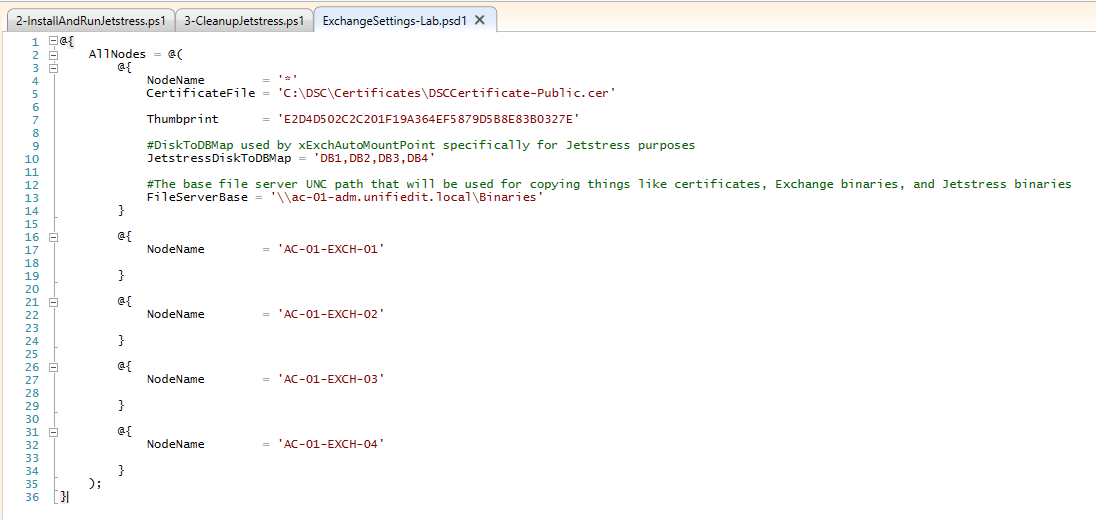 Le script contient le block de configuration qui s’appelle « InstallAndRunJetstress » avec un block de configuration de Node qui définit 6 ressources avec la configuration de X propriétés pour chacune