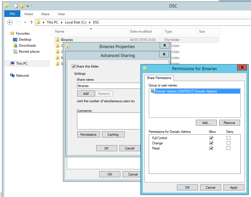 On partage notre repository et on le sécurise en donnant l’accès qu’au groupe d’utilisateurs que l’on souhaite (l’accès au share se fera au travers de credential fournis lors de la compilation de la configuration (dans la variable $FileCopyCreds))