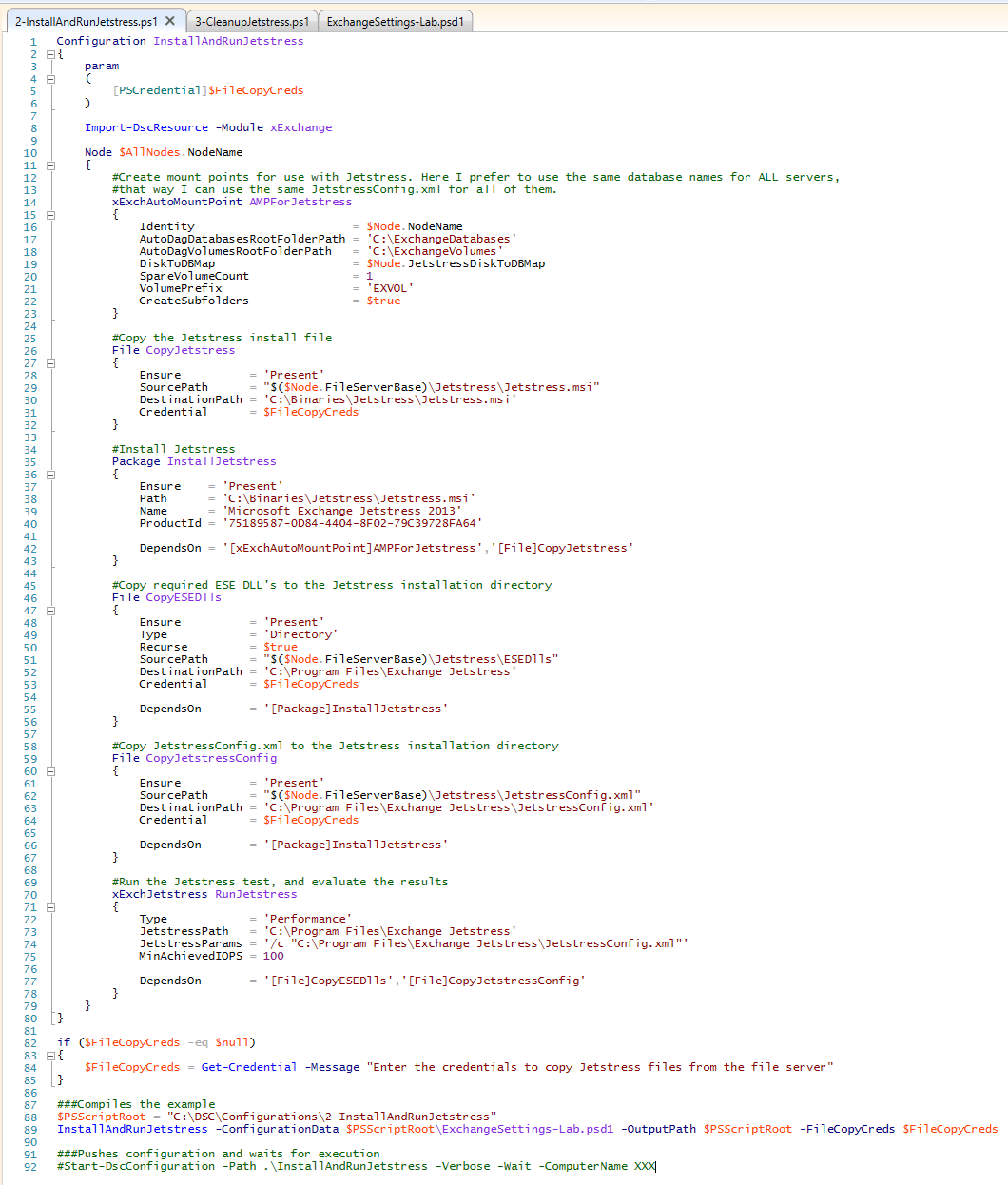On utilise ici la Ressource DSC xExchange d’où l’import initial « Import-DscResource -Module xExchange » c’est pour les définitions de xExchAutoMountPoint et xExchJetstress