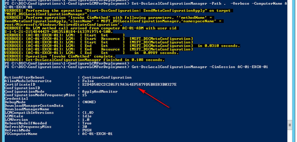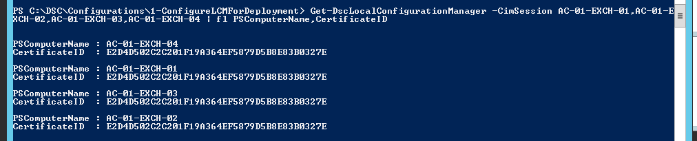 Get-DscLocalConfigurationManager -CimSession AC-01-EXCH-01,AC-01-EXCH-02,AC-01-EXCH-03,AC-01-EXCH-04 | fl PSComputerName,CertificateID