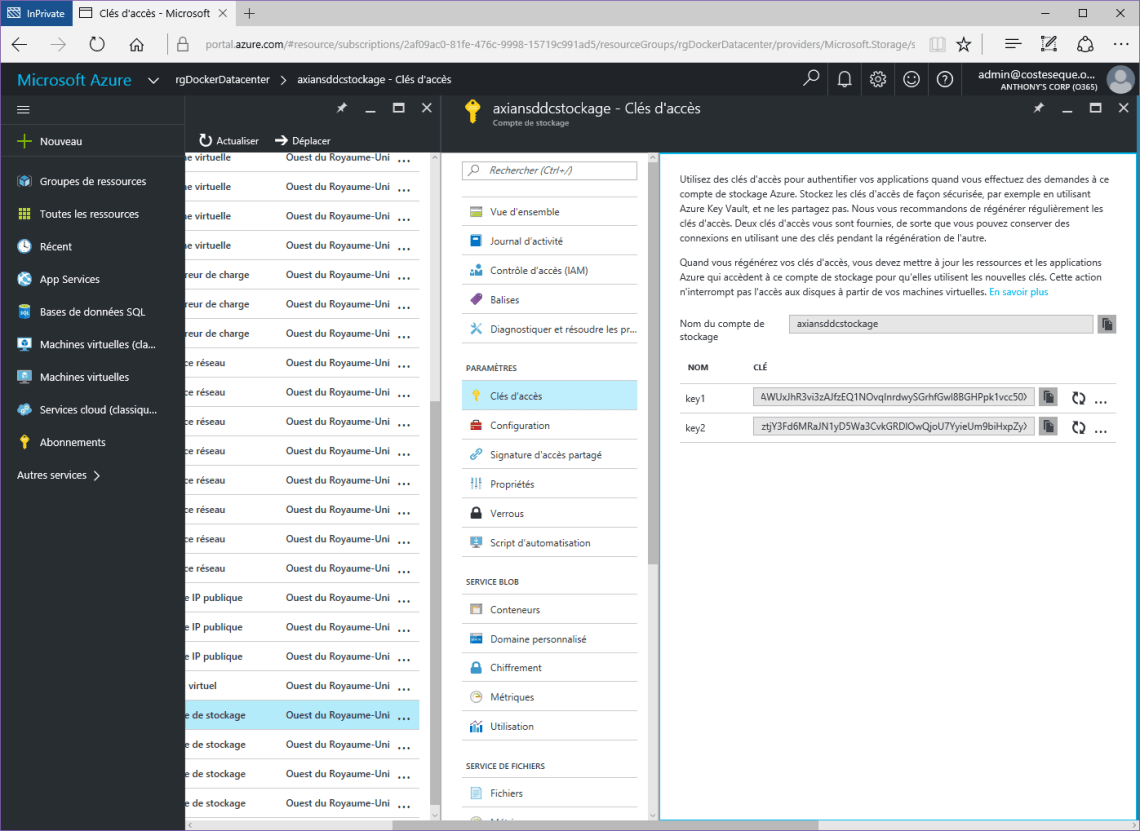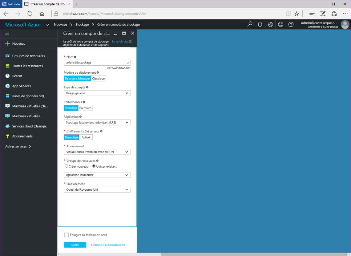 Ici je suis parti sur du LRS avec des performances « standard » que je rattache à mon ressource groupe rgDockerDatacenter