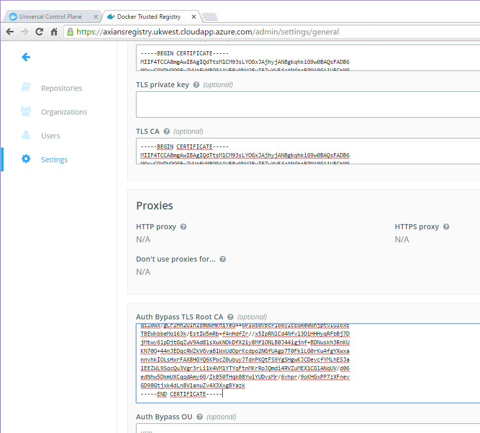 Dans Settings > Auth Bypass TLS Root CA on colle le contenu du « ucp-ca.pem » puis on sauvegarde les modifications