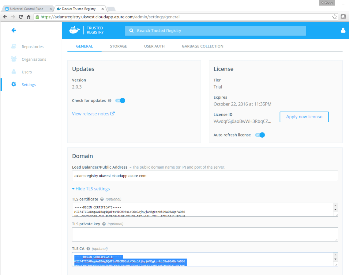 Dans la partie Settings > TLS CA il suffit de copier le contenu de la zone de texte et de le coller dans un fichier « dtr-ca.pem » sur le poste local