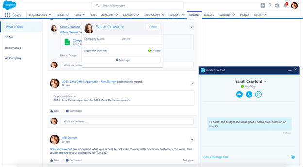 Microsoft vient de présenter une intégration des fonctionnalités Skype pour Business avec l’environnement Saleforce ce qui permet depuis l’interface d’interagir directement avec la personne concernée via Skype For Business