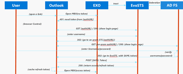 The user will present his SAML token to the service that delivers the access Token (boarding pass) i. e. the Security Token Issuing Service (STS) and will receive two access tokens. An access and a token to renew this access token (Refresh Token). Once equipped with these access tokens, the user will be able to access his mailbox at the door of the service (Exchange online).