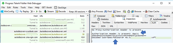As for applications of mobile messaging native to IOS or Android systems,’ therefore not Microsoft’s responsibility), they will send their connection information in basic mode to Microsoft services that will process this information and ask your identity provider (IdP) to validate access to the service. Other applications like Outlook 2010 SP2 will do the same. The figure below illustrates a basic authentication attempt generated by a client that does not support modern authentication and decoding of login information.