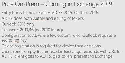 C’est le cas pour Exchange 2019 qui sera un produit Pure Modern Authentication et qui ne supportera plus le client Outlook 2013. La version minimale sera par conséquent Outlook 2016 comme le précise la diapositive suivante.