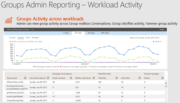 - Surveillez les rapports d’engagement – Le portail Office 365 Admin Portal dispose de bons rapports qui peuvent vous montrer combien d’utilisateurs utilisent le groupe, la fréquence et les fonctionnalités qu’ils utilisent. Ces rapports peuvent vous aider à concevoir votre formation de suivi et de formation des utilisateurs et à mettre en évidence les domaines dans lesquels vos utilisateurs tirent le plus de valeur du nouveau groupe. Voir: Rapports d’activité dans le centre administratif Office 365.