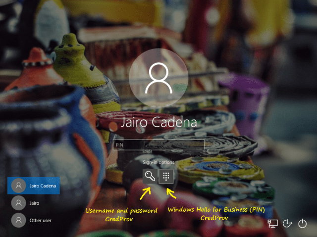 Dans l’interface utilisateur Windows Logon, l’utilisateur saisit des informations d’identification pour se connecter/débloquer le périphérique. Les informations de connexions sont obtenues par un fournisseur d’identification. Si vous utilisez un nom d’utilisateur et un mot de passe, le fournisseur d’identification pour le nom d’utilisateur et le mot de passe est utilisé, si vous utilisez Windows Hello for Business (PIN ou bio-gesture), le fournisseur d’identification pour la reconnaissance du NIP, des empreintes digitales ou des visages est utilisé.