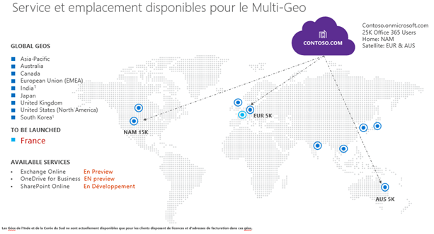 L’option Multi Geo est actuellement en preview pour Exchange Online et OneDrive. Microsoft prévoit de rendre cette fonction Multi-Geo disponible pour Exchange Online et OneDrive au cours du premier semestre de l’année civile 2018. Microsoft prévoit un aperçu SharePoint en 2018.