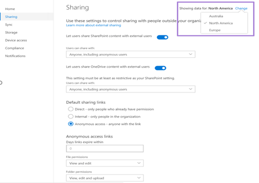 La gestion de one drive se fera par des centres d’administration qui seront relatif aux différents emplacements que vous avez activés comme le montre la figure ci-dessous. Les politiques en question pourront être différentes selon les sites géographiques.