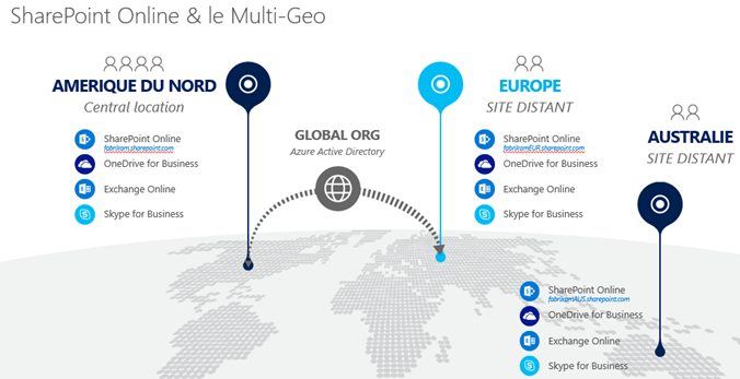 - Le Multi Géo fonctionne comme une seule organisation mondiale connectée avec un seul tenant 0365couvrant plusieurs emplacements géographiques